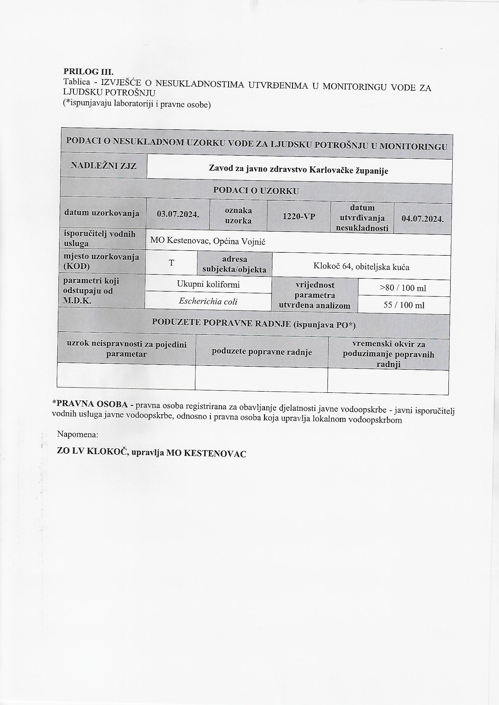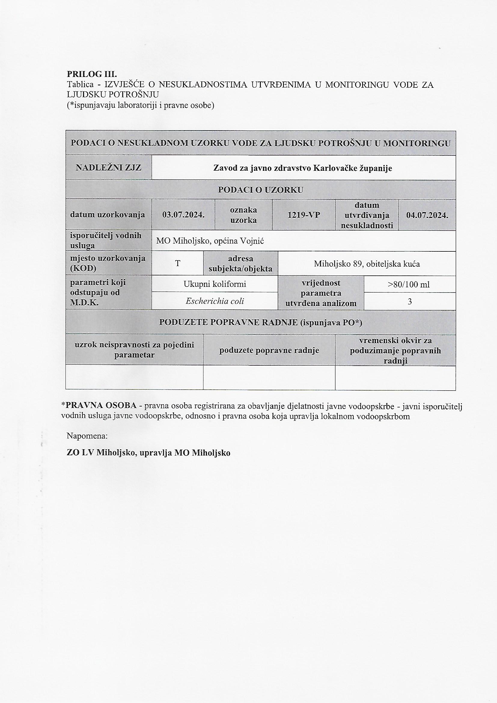 Zavod za javno zdravstvo Karlovačke županije dostavio je Izvješća o utvrđenim nesukladnostima u uzorcima vode za ljudsku potrošnju u okviru redovnog monitoringa vode za ljudsku potrošnju. Nesukladnosti u uzorcima vode za ljudsku potrošnju utvrđene su u uzorcima vode na lokalnim vodovodima u Miholjskom i Klokoču, kojima ne upravlja Vodovod i odvodnja Vojnić odnosno Vodovod i kanalizacija Karlovac.