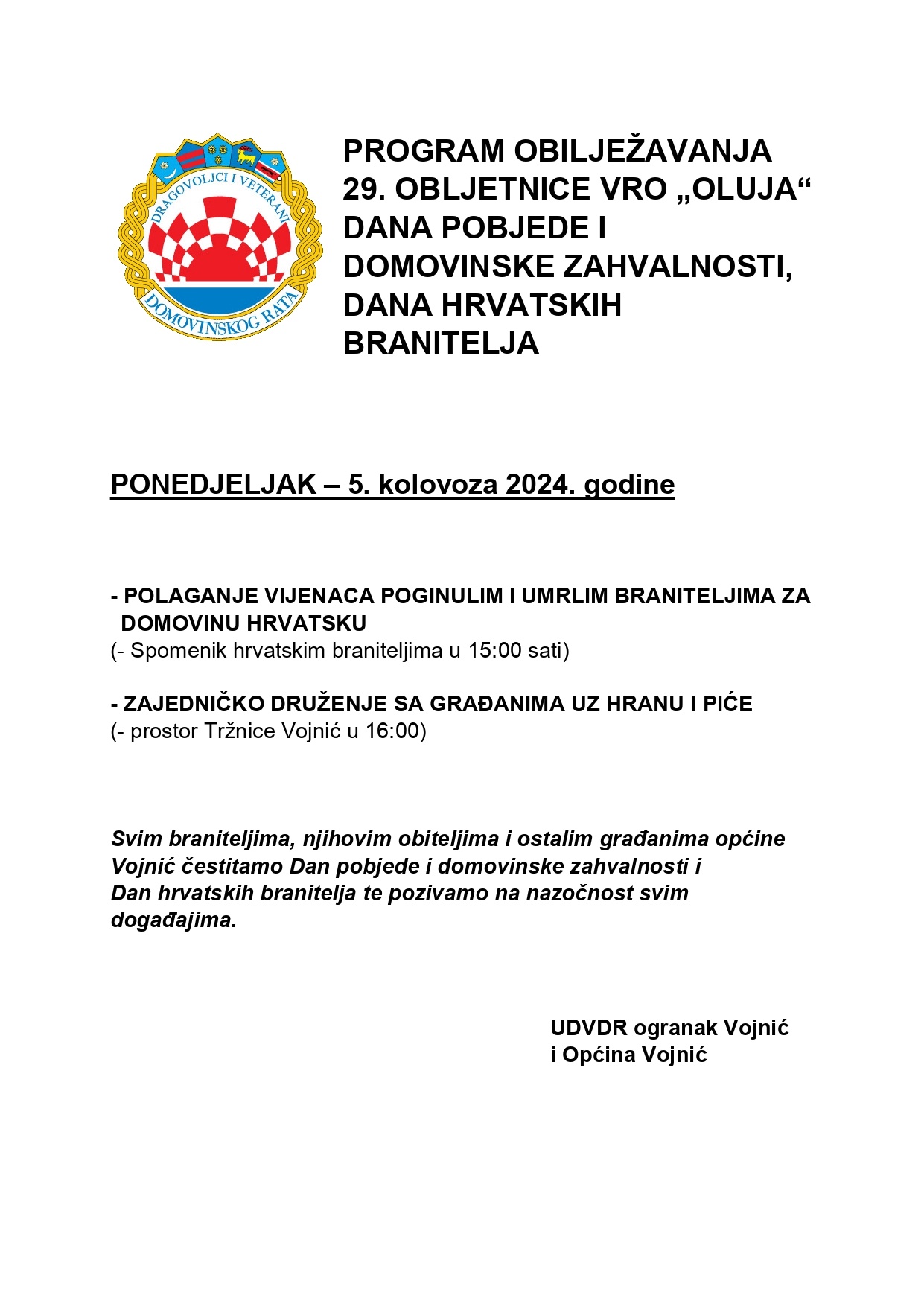 Program obilježavanja 29. obljetnice VRO “Oluja”, Dana pobjede i domovinske zahvalnosti i Dana hrvatskih branitelja